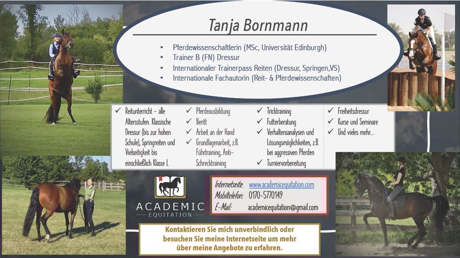 Tanja hat über 20 Jahre internationale Erfahrung in der Ausbildung von Pferden und Reitern aller Altersstufen, verschiedenster Rassen und Ausbildungsständen. Sie ist qualifiziert und lizensiert, Reiter und Pferde in der Dressur, im Springreiten und in der Vielseitigkeit auszubilden.