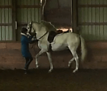 Once the horse has become more supple and 'obedient', i.e. it is comfortable with being worked in-hand and knows the meaning of a whip without showing fear, the horse can be started in school walk and Piaffe ('Piaffer') in-hand. Why do we start with the Piaffe so early? Another objective of classical dressage training is to shift load from the forehand to the haunches, making horse look more uphill and lighter through collection, allowing them to perform the airs above the ground, which can only happen through many years of systematic training and conditioning. Despite all our efforts put into horse training, some horses may never reach this stage.